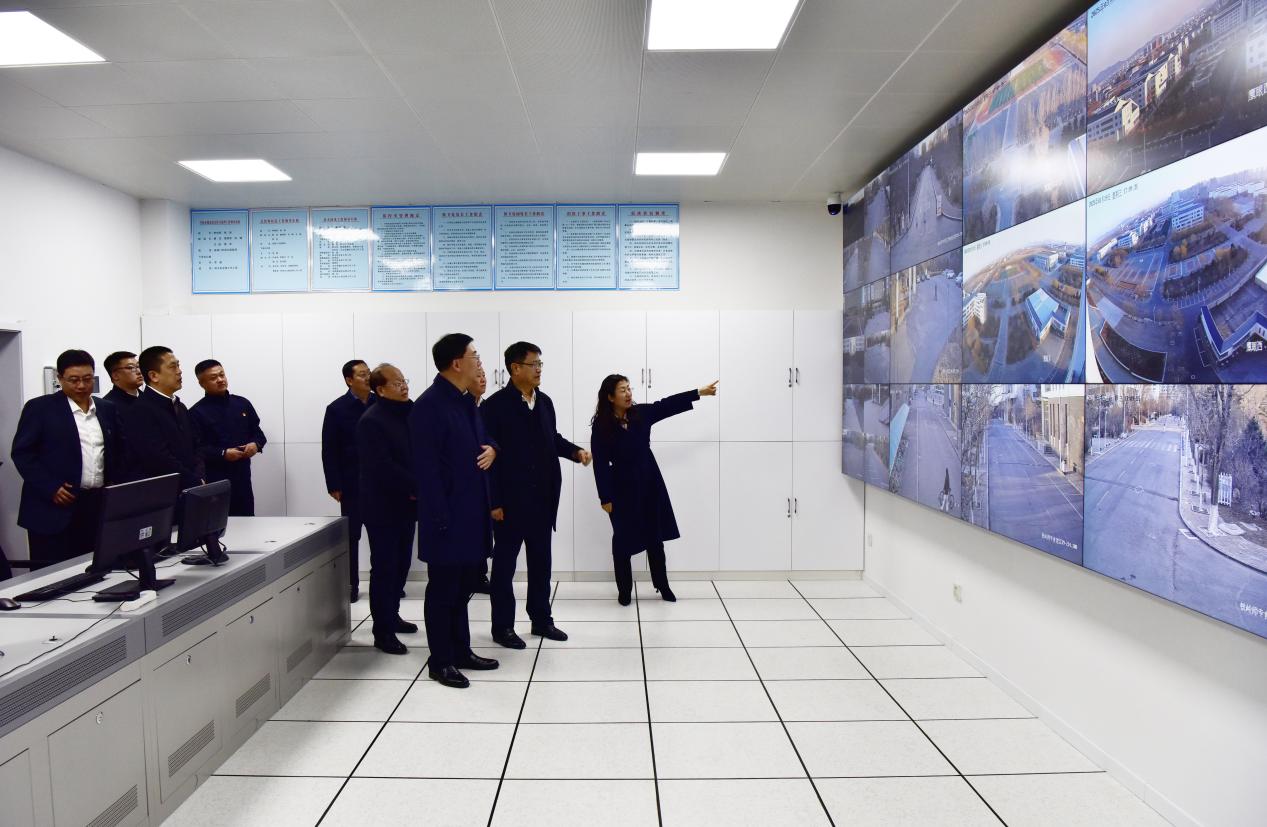 在校园监控中心,李友书记认真询问了校园监控设备安置,并现场查看了保安力量配备和监控设备运行。在听取讲解后,李友书记对校园安保工作表示肯定。