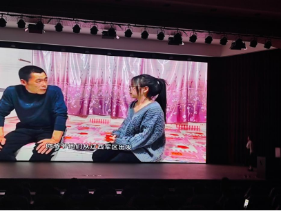第三篇章以“永远传承的抗美援朝英雄主义精神”为主题,主讲人化身革命战士讲述了抗美援朝战争的背景、决策过程以及辽宁省铁岭地区在战争中的贡献。外语学院学生杨莹与她的父亲通过红色实践视频《听父亲讲述爷爷的抗美援朝故事》,将志愿军战士深沉的家国情怀娓娓道来,全场齐唱《中国人民志愿军战歌》,激昂旋律响彻全场。